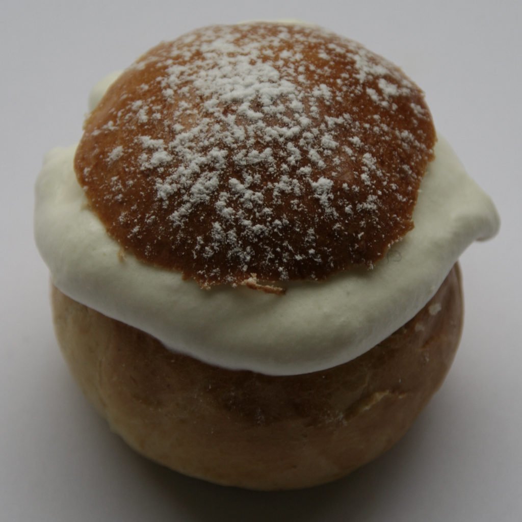 16. Doe een lepel geklopte, gezoete slagroom op de bolletjes. Plaats het kapje bovenop. Bestrooi met poedersuiker en dan lekker opeten