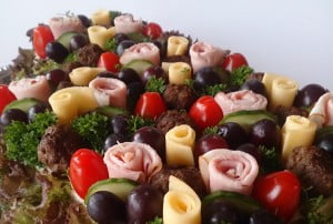 Smörgåstårta met vlees: Gevuld met een ham/ananassalade, basilicumspread, gerookte kipsalade en een patéspread. Gegarneerd met huisgemaakte gehaktballen, gerookte ham, kaas, druiven en tomaten.